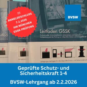 Der Bayerische Verband für Sicherheit in der Wirtschaft (BVSW) e. V. bietet den anerkannten Lehrgang zur Geprüften Schutz- und Sicherheitskraft (IHK) an. Der Kurs richtet sich an Personen, die ihre berufliche Qualifikation in der Sicherheitswirtschaft erweitern und vertiefen möchten.